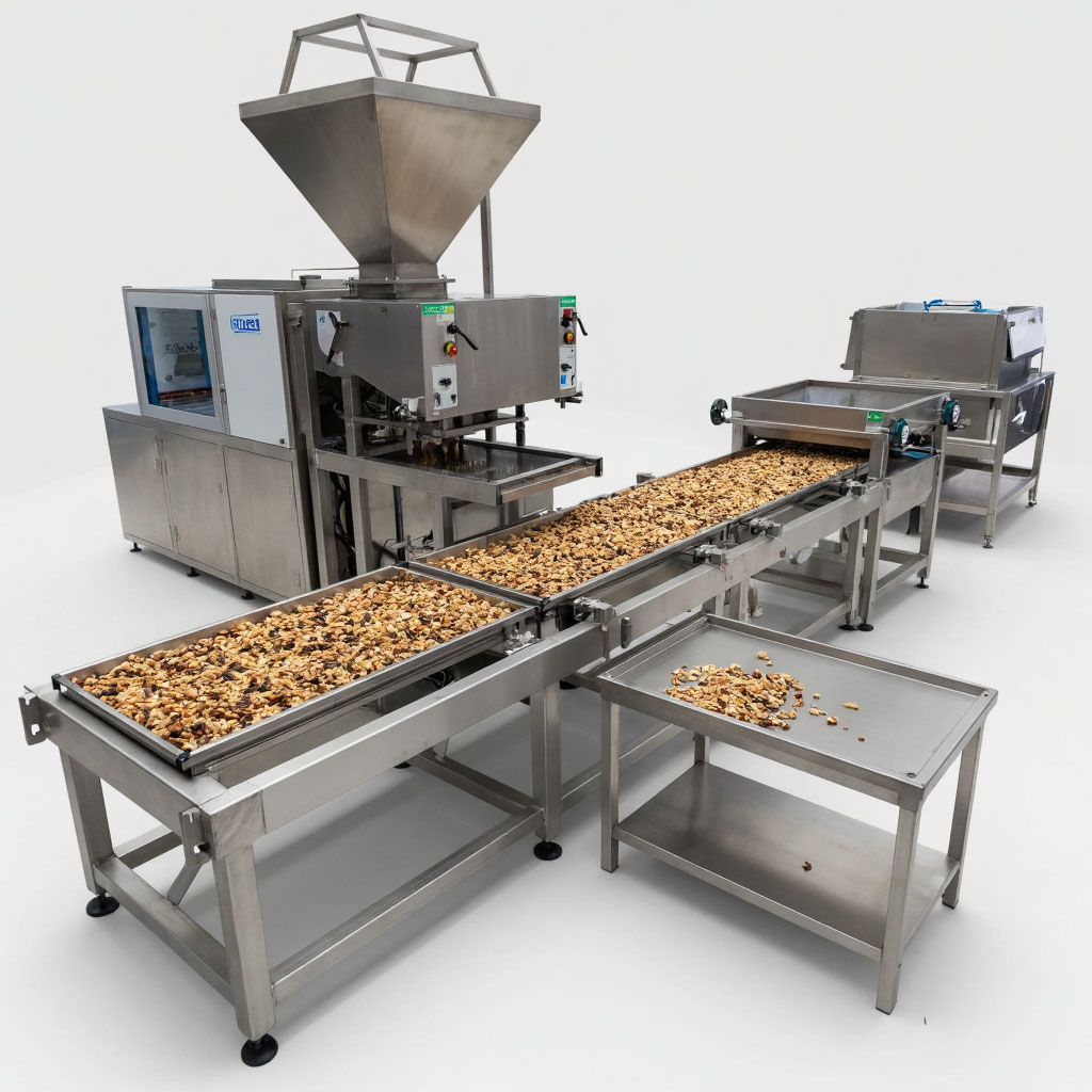 - Автоматическое оборудование для производства батончиков. В приемный бункер поступает еще не закристаллизованная смесь козинака и карамели (козиначное тесто). Козиначное тесто вытягивается валами и происходит формирование пласта. Далее пласт нарезается на заданные размеры.